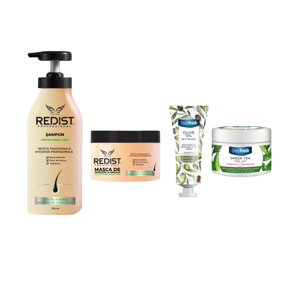 Spală părul cu un șampon ( recomandăm Șamponul pentru păr creț Redist din aceeași gamă). Șamponul deschide cuticula firului de păr, pregătindu-l să absoarbă nutrienții din mască.